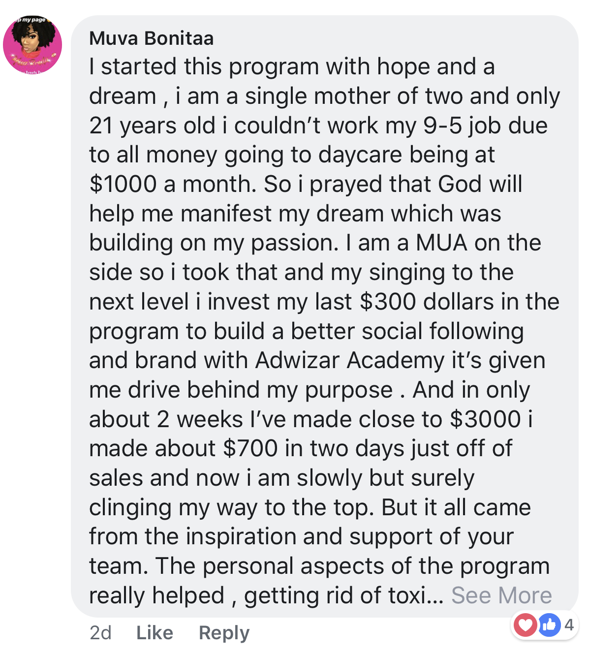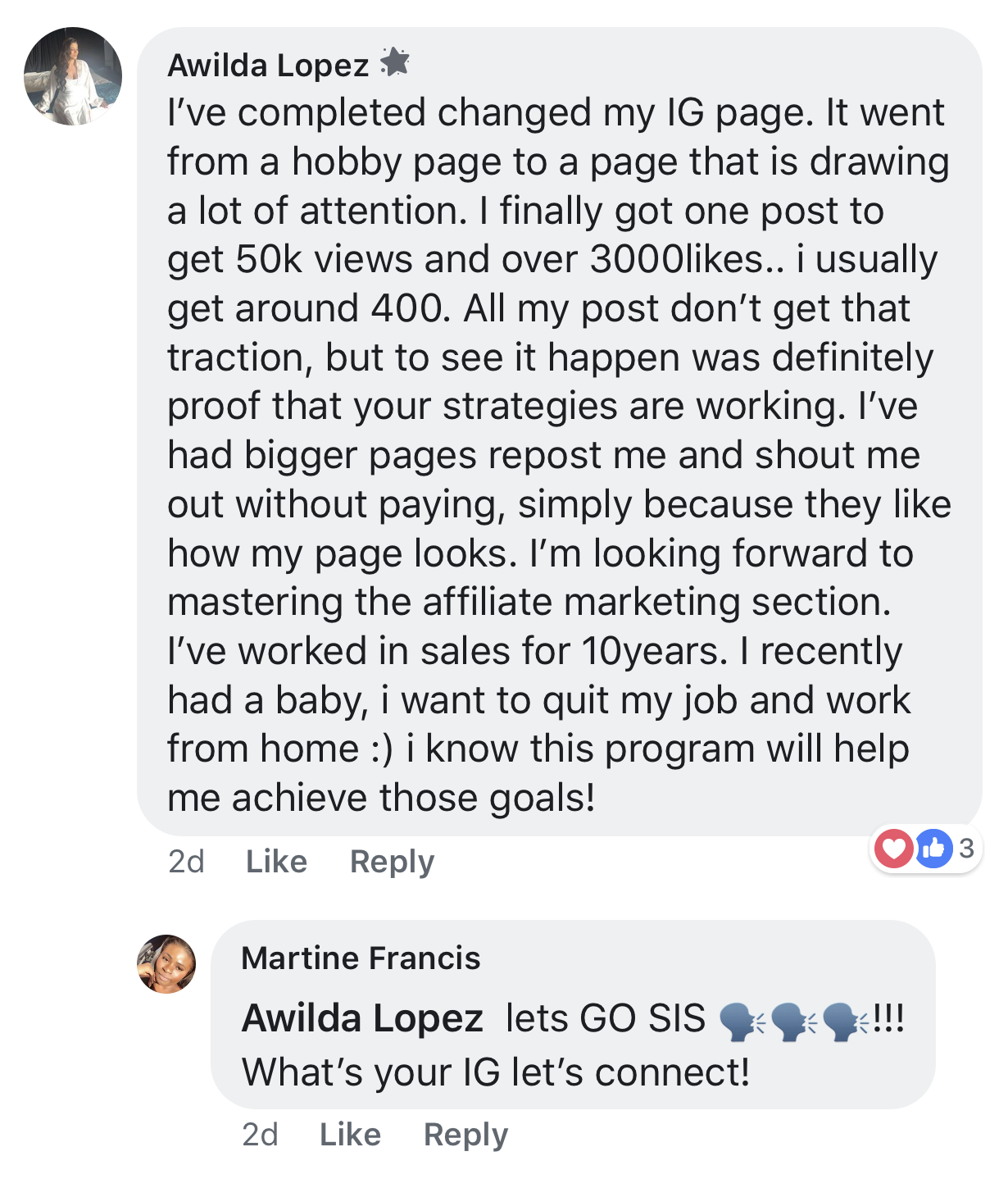 It’s definitely worth the money I spent. With the Instagram and Facebook strategies I was able to implement them and within just a few days I was about to make over 20k in sales.”